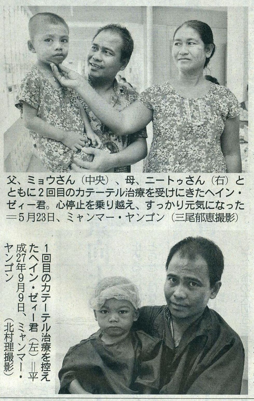![]() 日々元気になるうれしさ」 明美ちゃん基金50年 あの子は今4 成功率25%から生還 基金の医療段がミヤンマーで治療 ヘイン・ゼイー君(4) 生きられる確率は低いと宣告された命だった。ミャンマー最大の都市、ヤンゴンから西へ約50キ。のタンダベン村に住むヘイン・ゼィー君(4)は、生まれつき肺動脈弁が狭く血液が流れにきょうさくしょうくい重度の肺動脈弁狭窄症を患っていた。 「治療が成功する可能性は3割に満たない」東京女子医大の中西敏雄特任教授(66)は昨年9月、明美ちゃん基金のミャンマー医療団として訪れたヤンゴンの国立ヤンキン子供病院で、母の二ートゥさん(46)にそう告けた日のことを昨日のことのように覚えている。 理髪店を営む父のミョウさん(41)の収入では治療費は出せない。ニートゥさんは病に苦しむ息子の看病で働きに行けない。わらにもすがる気持ちで日本の医療団の検査を受けたが、見通しは厳しかった。放っておいたら数カ月で死ぬ。 だが、治療が奏功する確率は25%ほど。中西氏は「治療するかどうか、1日考えてみてください」と両親に判断を委ねた。翌日、両親は息子に治療を受けさせることを決意。 ところが、狭くなった弁を広けるため血管からカテーテルを入れた瞬間、恐れていた事態が起きた。ヘイン・ゼィー君の心臓が止まったのだ。「やはりだめか」 諦めかけた中西氏。だが、できるところまでやろうと心臓マッサージを施した。ほどなく、止まっていた心臓が動き始めた。 奇跡の生還から8カ月。医療団が2回目の治療を行った今年5月、ヘイン・ゼィi君の姿が再びヤンキン・子供病院にあった。1度目の治療で肺動脈弁はだいぶ広がったが、狭い部分はまだ残っている。この先のことを考えれば、さらに広けた方がよいと2度目の治療を受けにきたのだ。 二度目の治療は危なげなく成功し、中西氏はこれでもう治療は必要ない」と太鼓判を押した。寝たきりだったこれまでの日々を取り戻すかのように、活発に動き回るやんちゃ盛りの4歳。「家を飛び出して遊びに行ってしまうので、危ないったらない。本当に手に負えない」と愚痴をこぼす二ートゥさんの顔は昨年と打って変わって明るい。 「日々元気になっていくのが本当にうれしい。来年からは小学生。高等教育まで受けさせて、公務員になってほしい」命の終わりを覚悟した病院で、両親は将来の夢を語った。(道丸摩耶) |