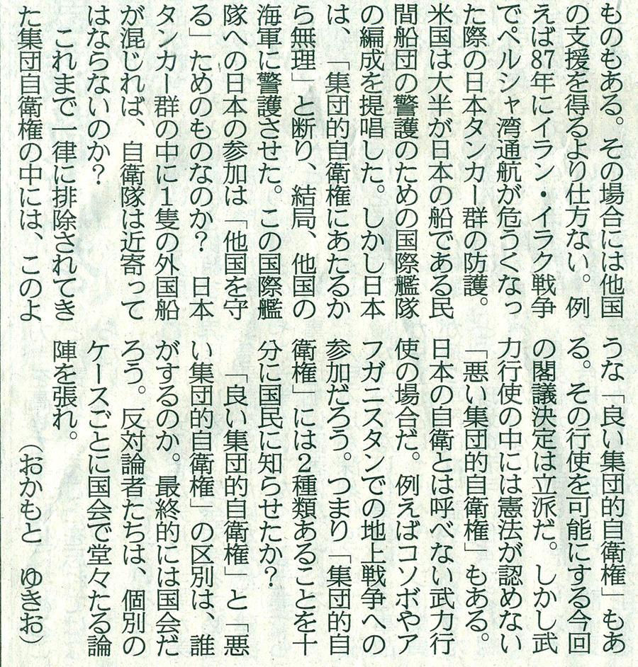 | 人界観望楼 シニアフェロー 岡本行夫(産経新聞H26.9.8) 良い、悪い集団的自衛権 集団的自衛権に対しては、まっとうな反対論もあるが、「戦争の足音がひたひたと迫っている」という、例によっての巻き込まれ論も多い。1960年の日米安保条約採択の際にさんざんなされたあの議論だ。平和国家日本が米国の戦争に巻き込まれると。当時、ソ連のフルシチョフ首相は、安保条約を結べば日本は核攻撃を受けても文句を言えないと桐喝した。 しかし、岸信介首相が政治生命と引き換えに安保条約を成立させて以降、日本は戦争に近づいたか? 事実は逆だ。日本への攻撃は米国への攻撃と見なすという安保条約に守られて日本は稀(まれ)にみる平和の中に繁栄してきた。巻き込まれ論者は、今や国民の8割が支持する日米安保条約を読み返してほしい。条約は、日本は極東の平和のために、「米国に巻き込まれる」どころか米国を積極的に後方支援するという取り決めだ。 台湾や朝鮮半島有事の際には、米軍機が日本の基地から発進して侵略国を攻撃することも想定されている。こうして極東に平和が50年以上も前から保たれてきた。 一部マスコミの情緒的な反対は相変わらずだが、一方、政府も国民に無用の心配を与えなかったか。青竜刀でヒゲをそるようなことはなかったか。57年の最高裁大法廷は、日本が自衛の権利を有していることを明確にした。しかしその後の政府は、日本に認められている自衛権は「個別的」なものだけで「集団的」なものはダメと、作らなくてもよい区別を作り、その際「集団的自衛権」とは「他国の防衛をその内容とする」行為だと定義した。 つまり、「日本が単独で自衛する以外の行為は、すべて他国を守る行為」と決めつけたわけだ。法制局の荒っぽい議論であった。憲法が認める日本の自衛行動の中には、単独ではなし得ないものもある。その場合には他国の支援を得るより仕方ない。 例えば87年にイラン・イラク戦争でペルシャ湾通航が危うくなった際の日本タンカー群の防護。米国は大半が日本の船である民間船団の警護のための国際艦隊の編成を提唱した。しかし日本は、「集団的自衛権にあたるから無理」と断り、結局、他国の海軍に警護させた。 この国際艦隊への日本の参加は「他国を守る」ためのものなのか?日本タンカー群の中に1隻の外国船が混じれば、自衛隊は近寄ってはならないのか? これまで一律に排除されてきた集団自衛権の中には、このような「良い集団的自衛権」もある。その行使を司能にする今回の閣議決定は立派だ。しかし武力行使の中には憲法が認めない「悪い集団的自衛権」もある。 日本の自衛とは呼べない武力行使の場合だ。例えばコソボやアフガニスタンでの地上戦争への参加だろう。つまり「集団的自衛権」には2種類あることを十分に国民に知らせたか? 「良い集団的自衛権」と「悪い集団的自衛権」の区別は、誰がするのか。最終的には国会だろう。反対論者たちは、個別のケースごとに国会で堂々たる論陣を張れ。(おかもとゆきお) ![]() ![]() |