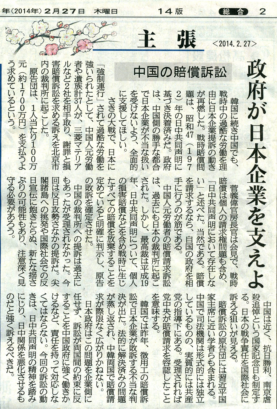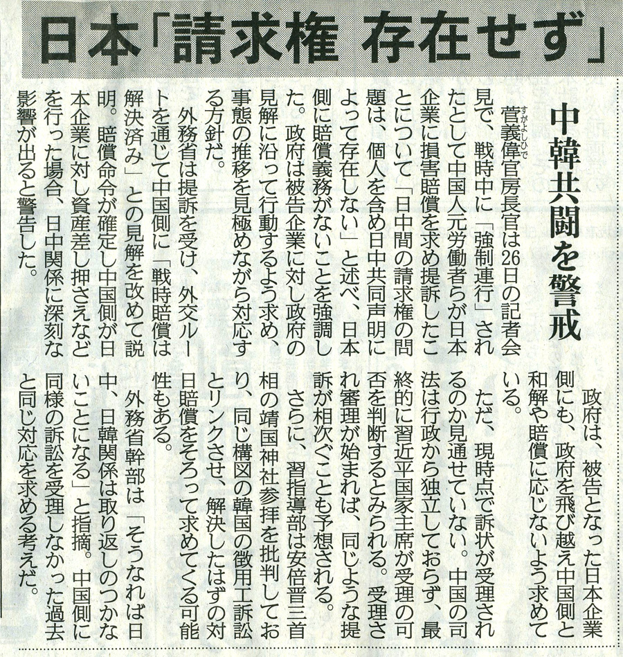 | 中国政府対日訴訟を支持 「強制連行問題解決促す」 【北京=矢板明夫】第二次大戦中に日本へ「強制連行」され、日本国内の炭鉱などで働かされたとして、中国人元労働者や遺族らが26日、日本企業を相手取り、損害賠償と謝罪を求める訴状を北京市第1中級人民法院(地裁)に提出した。 訴状が正式に受理されれば、日本の戦時「強制連行」をめぐる中国国内で初の訴訟となる。日中関係への影響は必至だが、中国外務省の華春螢報道官は同日、「強制連行は日本軍国主義が犯した重い罪で、まだ解決されていない歴史間題だ。責任ある態度で問題を解決するよう日本側に促す」と提訴を支持する考えを示した。 原告団は計37人。訴えられたのは、三菱マテリアル(旧三菱鉱業)と日本コークスエ業(旧三井鉱山)で、2社に対して1人当たり100万元(約1700万円)の賠償のほか、日中両国の主要メディアに謝罪広告を掲載するよう求めている。原告代理人の康健弁護士は、「2社に連行された被害者は計9415人」と主張。法律的には被害者全員の参加が可能だとの見解を示しており、原告団が拡大する可能性がある。 北京での提訴に続き、今後は河北、山東各省など戦時中、日本の勢力圏にあった地方でも同様の訴訟が起こされる見通しだ。被告となる日本企業も30社以上に膨らむとみられる。「強制連行」問題で、これまで中国国内の裁判所に提出された訴状が受理されたことはない。仮に今回受理されれば、外交レベルで「解決済み」とされてきた戦争賠償の請求間題を「民間賠償」として蒸し返す形となり、中国の方針転換を示すものとなる。 受理の可否は形式上、裁判所が判断するが、中国の司法は中国共産党の指導下にある。中国の法曹関係者の間では、最近の日中関係の悪化などを受け、訴状は受理される可能性が高いとの見方が支配的だ。一方、一旦受理されれば、日本企業を訴えるケースが全国で相次ぎ、日本企業の対中投資や日中貿易などに大きな影響が出る恐れがある。習近平指導部は中国経済への影響と国内外の反応を見ながら慎重に判断するとみられる。H2面に「主張」 ![]() ![]() ![]() |