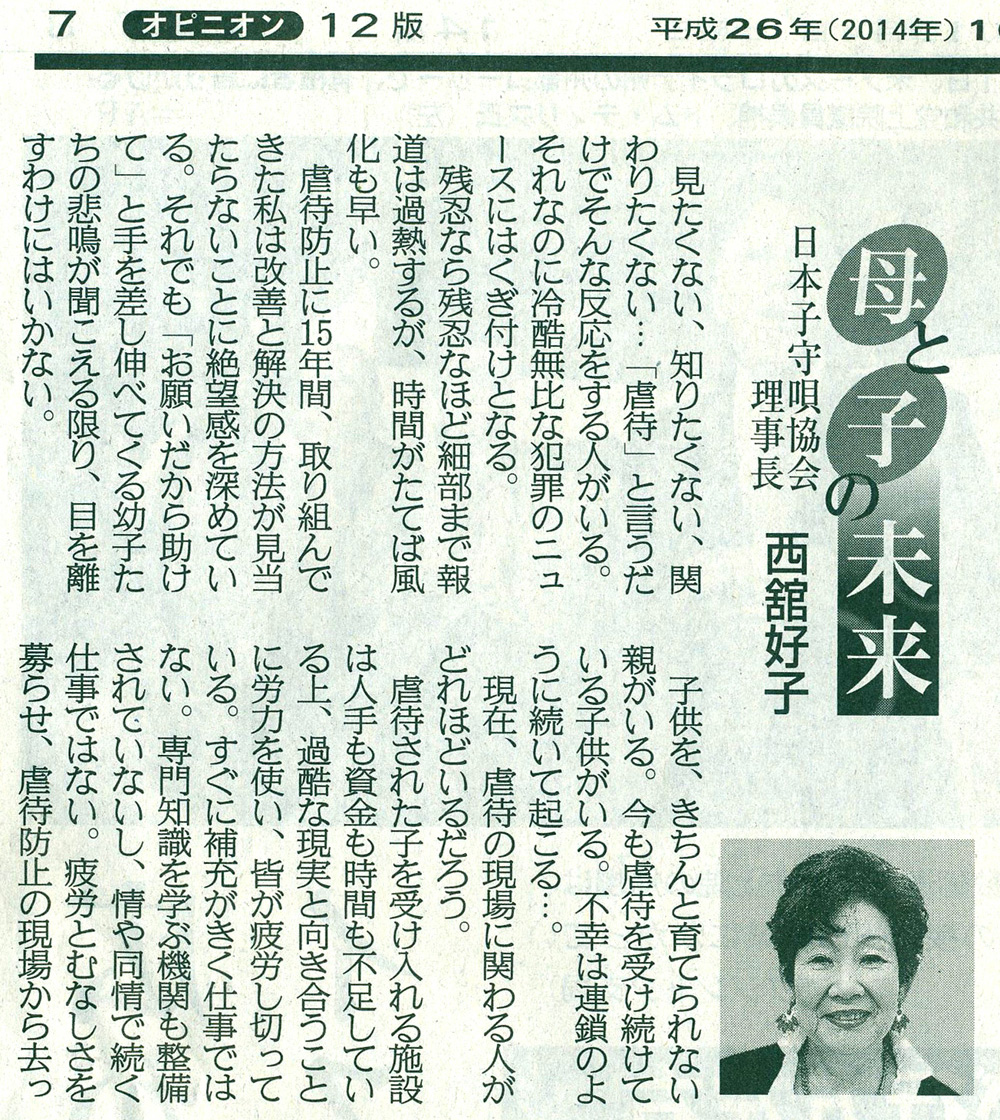 ていく人を何人も見てきた。多くの子供たちは、本来なら最も信頼する親との絆を断ち切られた傷を受けて収容される。「愛されたい」という欲求は「愛されなかった」という結果の裏返しなのだ。嘘や虚言、自傷を抑えることは難しい。 そのすべてを公表し、そこから見えてくる問題に取り組むことができればいい。だが、そこにはプライバシーや人権が立ちはだかる。症例ひとつ発表できず、発表すれば、「それは誰で、なぜ発表するのか」「個人の尊厳に関わることは許されない」と騒ぐ人がいるから、なかなか真実と実態を把握することができないのだ。 それが虐待している実の親であっては何をかいわんや、である。ここにもモンスターペアレンツがいる。そんな親にかぎって全ての責任を社会に転嫁し、自分の責任を回避していることが多い。 虐待がもはや個人や施設の力だけで解決できないのは"はっきりしている。世相も家庭も教育も生活のありようも情報もすっかり変わってしまった今、虐待の加害者も被害者も同じく、人間性を見失い、心が壊れてしまっているのかもしれない。 ではどうすればいいのか。まずは家庭という「根」を女性たちが今一度見直すことだ。女性が「命」に目を向ければ、それを育む家庭における母親の役目の重要性も見えてくる。教育現場でも虐待防止は家庭一「根」見直しから形式ばかりでなく本当の意味での「命」に目を向けてほしい。 生まれたことを怨む人間が育てば、ゆがんだ「命」が放たれてしまう。セックスはおおらかに表現されているのに、命を愛(いと)おしむ賛歌の声は届かないままだ。性虐待が増加する一因はそこにあるような気がしてならない。 日本人がよき伝統として守ってきた「家」という柔らかで、優しいシステムが崩壊し、機能を失いつつあるならば、社会や法が徹底的に子供を守ることをもっと明確にすべき必要があるかもしれない。虐待されたり、親に殺されたりするよりもずっといい。 生まれてきた命…。どんなことがあっても生き抜いてほしい。決して虐待させたり、死なせてはならない。 |