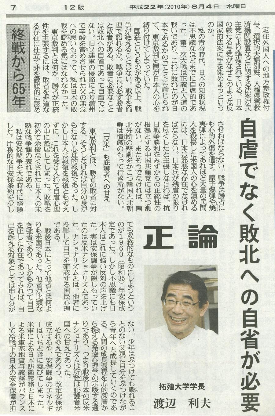 | ・・・保されるや、反米ナショナリズムは一挙に沈静化した。70年安保とは、日米の一方が1年前の事前通告により条約の自動廃棄を司能とする改定であったが、この時には安保闘争らしきことは何も起こらなかった。60年安保闘争が反米ナショナリズムの一時の甘えでしかなかったことの証左である。 慙愧(ざんき)に耐えないのは、反米ナショナリズムの沈静化と同時に第9条改正をめざす自主憲法制定へのエネルギーもまた萎縮してしまったことである。安保改定の成功が憲法改正への意気をも阻喪(そそう)させて、自立への構えは保守陣営からもふうと消え去ってしまった。 漂流のすえの反国家思想 この間、昭和40年を前後する頃からベトナム反戦運動が多少の高まりをみせたが、日本は戦争の当事者ではない。戦争の惨禍が自国に及ぶことなどありえないという無意識の前提があっての安逸なる反戦運動であった。後に北ベトナムの指導者自身がこの戦争は共産勢力による南北統一戦争であったことを証言しても、反戦運動で名をなした知識人のすべてが頬かむり、まことに不誠実な反米ナショナリズムであった。 冷戦崩壊を前後する頃からにわかに頭をもたげてきたのが、歴史教科書、従軍慰安婦、南京虐殺、靖国参拝などの「歴史認識問題」である。自虐の情念の矢は米国にではなく自国の歴史に向けられ始めた。冷戦崩壊により敵が消滅し安んじて自虐の情念を噴出させることができるようになったのである。恐ろしきかな、情念の噴出はついに国家の指導者をまで巻き込んでしまった。座史教科書に関する近隣諸国条項、従軍慰安婦問題についての河野談話、戦後50周年に際しての村山談話などがその端的な事例であり、自虐史観は「制度化」の段階にいたった。 そして民主党政権は、冒頭の3つの法案に象徴される反国家思想の「制度化」を開始したのである。戦後65年、漂流をつづけてきた政治思想の帰結が国家解体の思想だというのであれば、日本の再生を願う者は「維新」を唱導し始めるかもしれない。(わたなべとしお)2010.8.4 |
