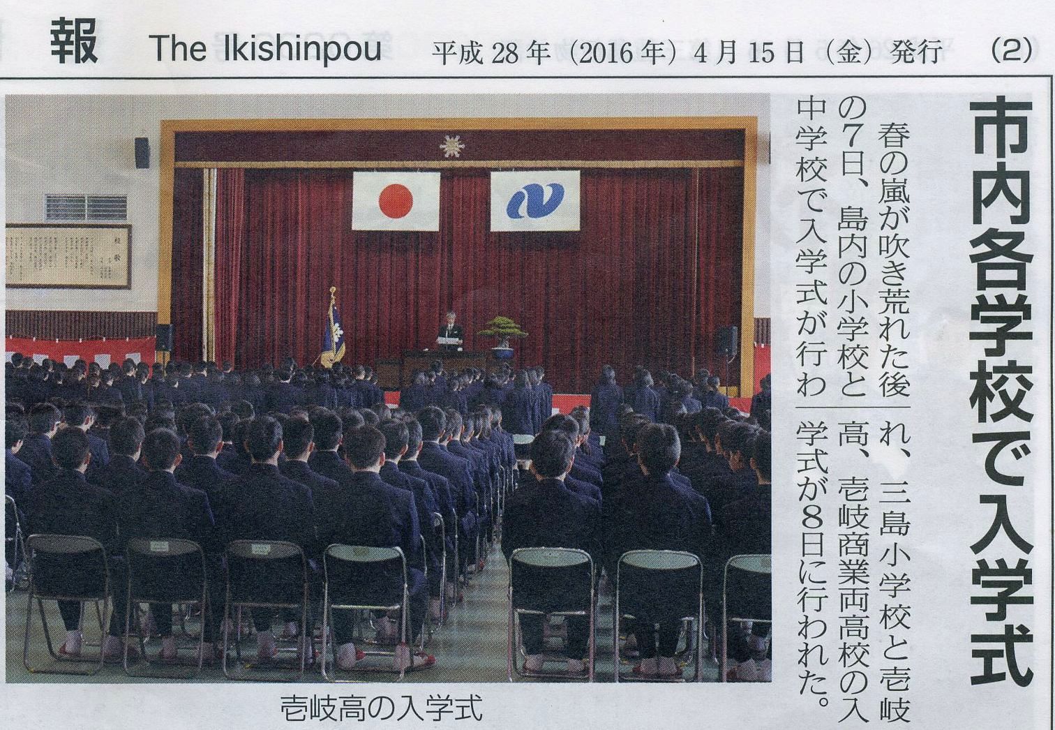 ![]() 市内各学校で入学式 春の嵐が吹き荒れた後の7日、島内の小学校と中学校で入学式が行わ れ、三島小学校と壱岐高、壱岐商業両高校の入学式が8日に行われた。 壱岐高の入学式 各学校には桜の花びらが舞い散る中、小学校ではピカピカの真新しいラ ンドセルを背負い、期待に胸を膨らませた新一年生が登校し、新入生を歓 迎した。 今年の小学校の入学者数は次の通り。 ▽盈科55人 ▽渡良7人 ▽三島1人 ▽柳田8人 ▽沼津7人 ▽志原10人 ▽初山5人 ▽鯨伏7人 ▽勝本10人 ▽霞翠16人 ▽芦辺8人 ▽田河15人 ▽八幡11人 ▽那賀9人 ▽箱崎9人 ▽瀬戸12人 ▽石田37人 ▽筒城8人計235人。 中学校の入学者数は、 ▽郷ノ浦102人 ▽勝本47人 ▽芦辺72人 ▽石田46人 【高校】 ▼壱岐高168人▽普通コース155人▽東アジア歴史・中国語コース13人 ▼壱岐商業112人▽商業科72人▽情報処理科40人 平成28年度全日本学童選手権壱岐予選 壱岐少年軟式野球連盟は、2日と3日に芦辺ふれあいグランドで全日本 学童選手権壱岐予選を開催した。 準決勝は勝本と石田で3対0で勝本、盈科と那賀で8対1で盈科。決勝 は勝本と盈科の戦いで、4対1で勝本が制した。 第26回危険業務従事者叙勲 壱岐振興局は7日、第26回危険業務従事者叙勲者を発表した。壱岐管内 該当者は、元長崎県警部補で郷ノ浦町の松永修武さん(70)が瑞宝単光章 を受章。 本県受章者数は計74人。瑞宝双光章は34人、瑞宝単光章は40人。諸種 区別では警察官25人、自衛官38人、消防吏員7人、刑務官4人。 ' |
