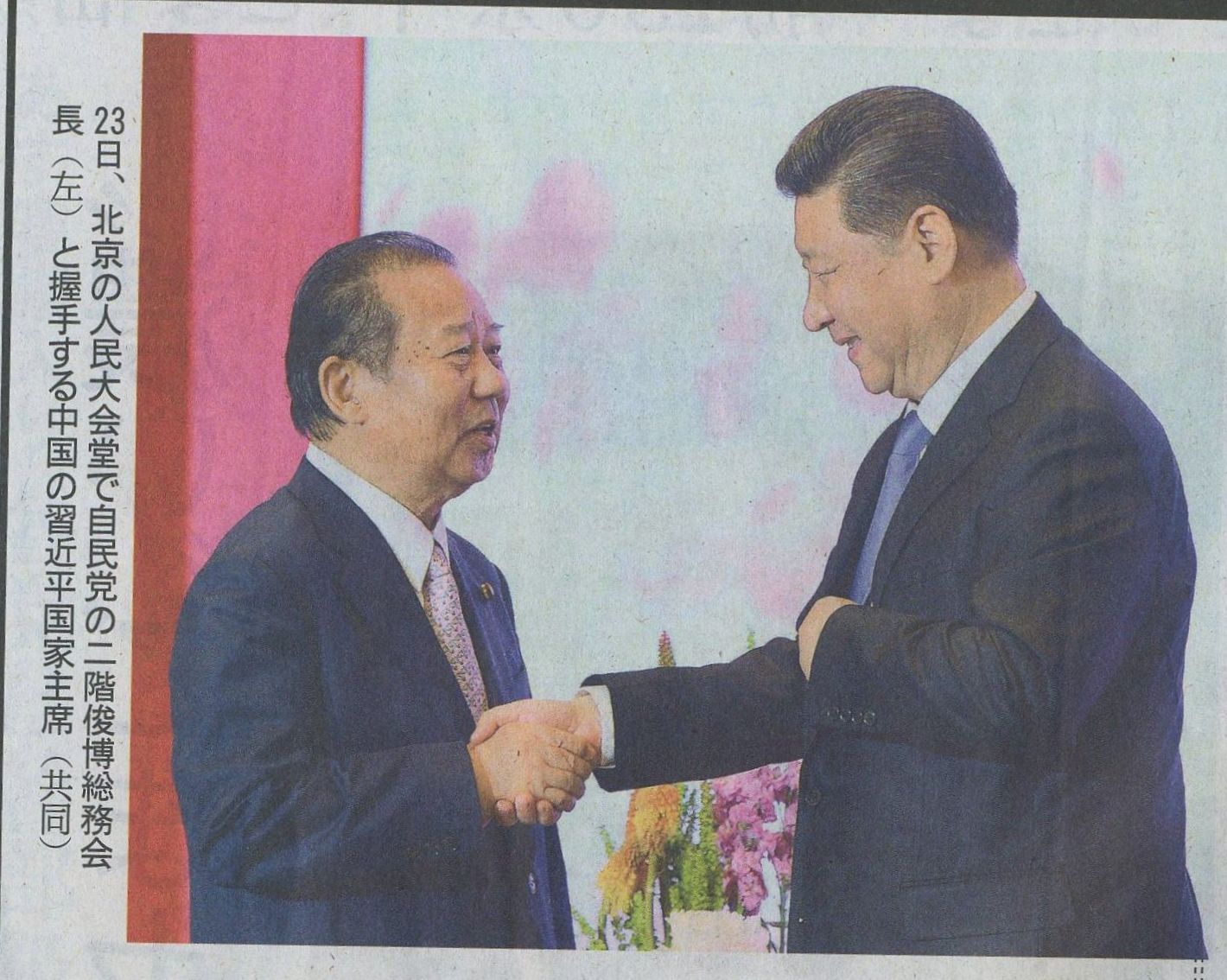 | 歴史認識めぐり"常套手段" 安倍政権を批判 訪中団には懐柔 {北京11矢板明夫】中国の習近平国家主席は23日白民党の二階俊博総務会長が率いる約3千人の訪中団(財界や日中友好団体の関係者らで構成)と面会した際、安倍晋三政権の歴史認識を暗に批判する一方、訪中団のメンバーを「正義と良識のある日本人」などと褒めたたえた。日本政府と一般の国民を切り離す二分論」を展開し、日本の世論に揺さぶりをかけようとする思惑があるとみられる。 習氏「二分論」日本世論揺さぶり 訪中団には懐柔策 目中関係をめぐっては、月末から5月初めにかけて自民党の谷垣禎一幹事長高村正彦副総裁、額賀福志郎元財務相ら日本の要人が相次いで訪中し、それぞれ習主席との面会を求めたが実現しなかった。 ![]() 2012年11月に中国の最高指導者となった習主席は対日強硬姿勢を崩さず、日本政府要人と会うことを極力避けており、今回の二階氏訪中に関しても、「習主席には会えないのでは」 との見方が出ていた。ところが、習主席は人民大会堂で開かれた日中の交流式典に突然登場し、関係者を驚かせた。 ある中国共産党関係者は「習主席は日本の民間人に『日中関係悪化の原因はす べて安倍政権にある』と直接強調するのが目的だ」とした上で、「日本の世論を分断し、8月に発表される戦後70年の首湘激話や憲法改正の動きを牽制したい思惑もある」と指摘する。 日本政府と国民を区別する二分論は毛沢東時代からの対日工作の常套手段だ。「諸悪の根源は軍国主義の復活を図る有翼政治家にあり、日本国民は政府に洗脳された被害者だ」という論法で、日本のリベラル勢力などを味方につけることを目的にしているという。 習主席はこの日の講演で、唐代の詩人である李白と、唐で学んだ阿倍仲麻呂との友情などを例に挙け、日中交流には長い歴史があり、今後も民間交流を展開する必要性を強調した。その上で、日中戦争が中国国民に災難をもたらしだだけでなく、「日本国民もあの戦争の被害者だ」と主張わいきょくし、訪中団に「歴史を歪曲する動きに一緒に反対しよう」と呼びかけた。 「首相も喜んでいる」 【北京=沢田大典】自民党の二階俊博総務会長は24日、北京市内で記者会見し、安倍晋三首相の親書を中国の習近平国家主席に手渡した今回の訪中について「(電話で報告した)首相も喜んでおり、一応の成果を挙けた」と強調した。 二階氏は会見で、23日に北京の人民大会堂で開かれた中国政財界との交流会の最中、首相と複数回電話でやりとりしたことを紹介。「首相からは、ねぎらいの言葉があった。帰国後に(詳しく)報告したい」と語った。 また、二階氏は「(日中間で)これからよく知恵を出ししんし合おうという中、日本も真摯に応えていくことが大事だ」とも指摘。政府側に日中関係改善に向け、さらなる努力を促した。同席した経団連の御手洗冨士夫名誉会長は「有意義で充実したミッションだった」と総括した。 習氏は交流会で「日本軍国主義を美化・歪曲しようと寸る言動も許されない」などと述べ、安倍首相が今夏に出戦後70年談話を牽制。これについて二階氏は「日中は環境が違う」とした上で、「世界が注目している。日中問題がいかに重要か十分に分かった上で、首相は考えている」と語った。 二階氏、親書手渡し成果強調 |