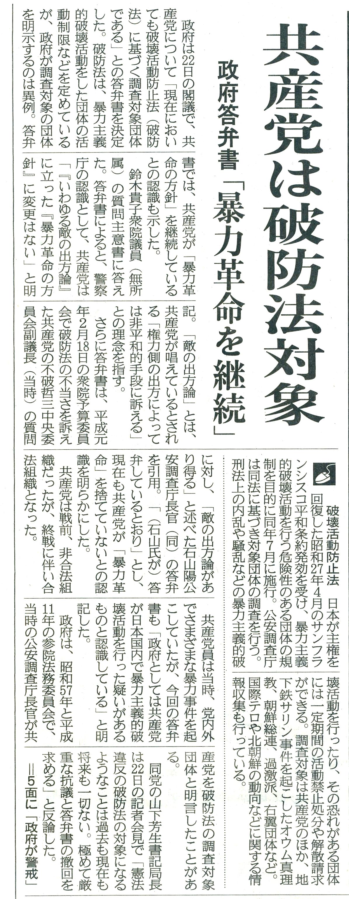 政府が共産党を破壊活動防止法(破防法)の調査対象であるとの答弁書を閣議決定したのは、極めて異例の対応となった。夏の参院選に向け、安全保障関連法廃止を目指した「国民連合政府」構想を提唱した共産党は、選挙協力を優先し構想を凍結したとはいえ、政権参画への意欲を強める。今回の答弁書決定は、いまだに綱領に「革命」を明記する同党への警戒の表れといえそうだ。