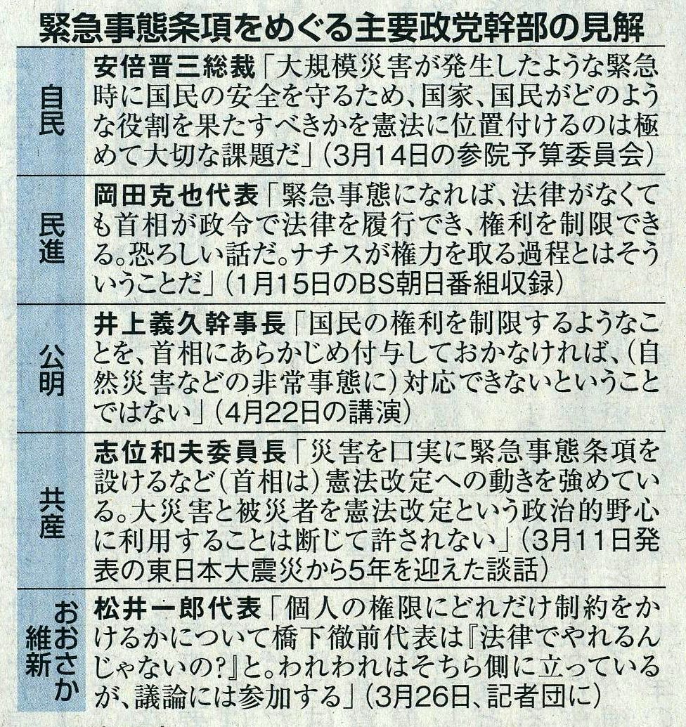 これに対し、民進党は談話で「安倍首相は憲法改正への野心を隠さず、夏の参院選は日本政治の分岐点となる」と指摘。共産党も「野党共闘を前進させ、憲法違反の安保法=戦争法を廃止し、立憲主義をとりもどす」と談話で訴えた。