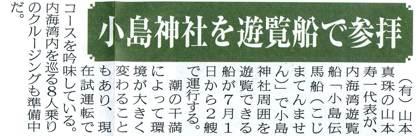 | 小島神社を遊覧船で参拝 (有)山本頁珠の山本寿一代表が、囚海湾遊覧胎「小島伝馬船(こじまてんません)」で小島押社周囲を遊覧できる船が7月1日から2艘で運行する。潮の干満によって環境が大きく変わることもあり、現在試運転でコースを吟味している。 内海湾内を巡る8人乗りのクルージングも準備中だ。山本代表は「子供の頃に、内海湾で親しんだ櫓漕ぎ舟。その楽しさを今、小島神社を訪れる皆に体験してもらいたいと、約1年前から夢を抱いてきました。 木船の櫓漕ぎ舟をと思いましたが、なかなか見つからず、櫓のみ数本手に入れることが出来たので、通常の2艘の小船を用意し、自分で木目調の色を塗りました。それぞれに「こじま丸」、「はこしま」と名前を付けました」と強い思いと経緯を語った。 エンジン音がしない静かな櫓漕ぎ舟になる。遊覧船により満潮時には行けなかった小島神社を楽しめ、海から眺める稜線など、全方位の風景を楽しむことができる。 また、衣装を着た船頭さんが同行し、気分を盛り上げる。干満で状況が大きくかわるので、小島神社への上陸はないが、島の裏側にある神社入口に向かって遥拝できる。また満潮時は、鳥居を船でくぐることもできる。 営業時間は午前9時からで、所要時間は約40分。料金は大人800円、小人400円、6才未満無料。定員は1艘につき船頭1人と乗客は5人まで。 問い合せ先は内海湾遊覧船CCao901841715222)山本へ。 ![]() |