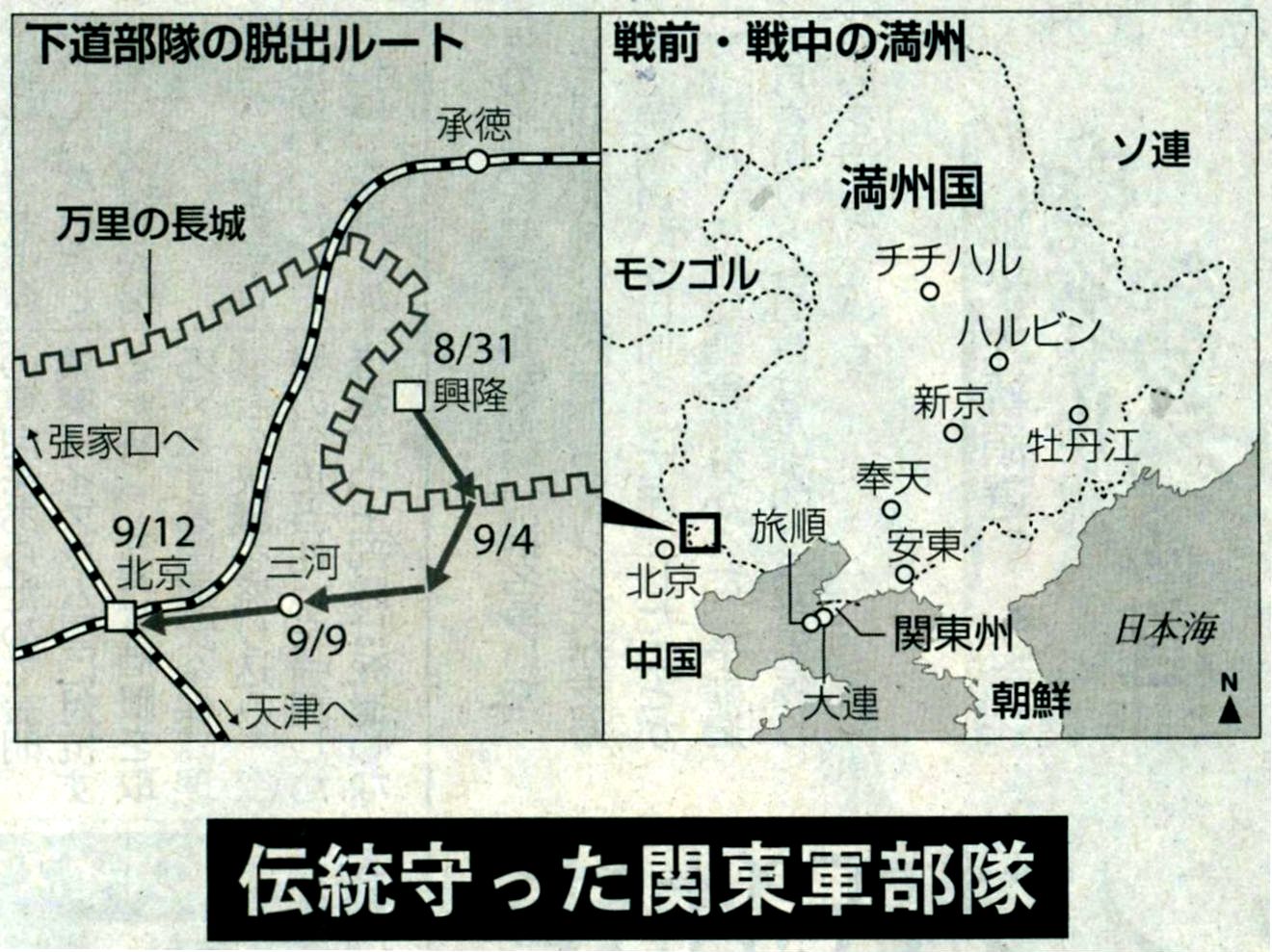| 在留邦人奇跡の脱出行 駐蒙軍(日本軍)司令部や日本と関係が深い蒙古連合自治政府があった張家口(ちょうかこう)。そこへ集結していた約4万人の居留民(在留邦人)を救うために、駐蒙軍司令官の根本博中将(昭和41年、74歳で死去)がソ連軍(当時)の武装解除要求をはねつけ、昭和20年8月15日以降も戦い続けた話はよく知られている。 居留民は、根本らの懸命の抗戦を「盾」に、まだ友軍(北支軍)がいた北京方面へ脱出する。避難者の中には民族学者の梅樟(うめさお)忠夫(平成22年、90歳で死去)や少年だった画家、作家の池田満寿夫(ますお)(同9年、63歳で死去)らがいた。 8月9日に満州へ侵攻したソ連軍は、居留民に対して非道な行為を繰り返し、軍人や警察官、官吏らは後に悉(ことごとく)シベリアへ送られ、抑留されてしまう。もし、根本が正直に武装解除要求に従い、停戦に応じていれば、同様の悲劇が待っていたかもしれない。 今回書くのは、その話ではない。駐蒙軍の隣、満州国熱河(ねっか)省・興隆(こうりゅう)にあった関東軍第108師団歩兵第240連隊(通称・満州881部隊)第1大隊(下道(げどう)部隊)による「奇跡の脱出」行のことだ。 「居留民を置き去りにしてさっさと後退した」と非難を浴びた関東軍にも勇猛果敢に戦い、民間人の救出に死力を尽くした部隊は少なからずあった。 20年8月31日、ソ連軍と中国共産党軍(八路軍)に挟まれ、豪雨のために孤立していた下道部隊は窮余の策で北京へと向かう。この決断が居留民約270人の命を救うことになる。8月末、興隆の第1大隊を率いる下道重幸大尉(昭和53年、78歳で死去)は苦悩していた。本来、下道部隊が向かうべき連隊本部がある承徳(しょうとく)までは約80キ。。だが、数日来の豪雨で道路や通信手段が寸断され、合流したり、指示を仰ごうにも連絡がつかない。 承徳にはすでにソ連軍が入ったという。偵察に出した兵は攻撃に遭い、負傷して戻ってきた。さらに、大きな問題があった。興隆にはまだ会社員や自営業者、公務員らと家族約270人の居留民が残っている。ここにもソ連軍が来るのは時間の問題であろう。 「置いてはいけない」。下道はソ連侵攻後に連隊長が行った訓示を思い出していた。881部隊は関東軍のルーツである独立守備隊の魂を受け継ぐ部隊であり、本来の任務である「居留民保護に全力を尽くせ」という内容だった。 日露戦争に勝利し、関東州(大連、旅順など)や東清鉄道の南部分(後の満鉄線)と鉄道や駅周辺の土地(鉄道付属地)の権利を獲得した日本は満州経営に乗り出す。そして、鉄道線と租借地に住む居留民(日本人)を守るために発足したのが関東軍の前身である。 それは、関東軍固有の独立守備隊と内地から2年交代で来る駐箚(ちゅうさつ)師団で構成され、881部隊は第9独立守備隊(承徳)の系譜を引く。「関東軍発祥の精神を忘れるな」というのは、そういうことだ。 「こうなったら居留民を連れて北京へ(西へ)向かうしかありません」。部下の幹部将校らは死中に活を求めるべく、連隊がある承徳とは反対方向、約120キロ離れた北京へ抜けることを進言した。 簡単な道ではない。大隊には終戦で崩壊した満州国軍の日系将校も加わり、軍人が約750人。居留民と合わせて約1千人の大所帯で年寄りや女性、子供が多く、妊婦もいる。数倍、数十倍の八路軍が待ち構えている危険地帯を隊の前後を武装した軍人が守りながら道なき道を行き、万里の長城を越えるのだ。 下道はついに決断する。8月31日夜、軍民一体となった「苦難の脱出行」が始まった。 満州に憧れた15歳の少年 戦後、新潟県議を務めた清田三吉(90)は下道部隊で糧秣を担当する一等兵であった。清田は"宝石箱"を夢見て満州へ渡った少年の一人である。16年4月、地元・新潟の農林学校を出て、新京の興農合作社(農協のような組織)へ入る。まだ15歳だった。 「当時は、日本中が『満州へ満州へ』という雰囲気だった。私も満州のでっかい夕日や大地に憧れてね。そこで農業をやってみたい、「満州の土と化さん」という情熱と志に燃えていましたね」。四平省の農村などに約3年半。19年11月、現地で召集で入隊し、ー年足らずでソ連の満州侵攻に遭遇したのである。 約一千人の隊列の先頭付近に清田はいた。「難路が続き、トラックや馬車、ロバなども途中で放棄するしかない。日中は猛烈な暑さになり、日射病のために何人かの幼児が息を引き取った。八路軍との散発的な銃撃戦は依然続いており、裏道を探してゆくので一日で10キロぐらいしか進めなかった。」 そして、最大の危機がやってくる。隊列は万里の長城を越し、清朝の歴代皇帝稜(東陵)近くに差し掛かっていた。ソ連軍追撃の危機からようやく逃れられた。という安心感から、2日間の休息をとっていた直後の9月4日、八路軍の軍使がきて、部隊の武装解除を要求したのである。 軍使は、武器を引き渡せば、北京までの安全は保証するという。だが、大隊長の下道は厳然と相手の要求を一蹴した。「武装解除はできない。どうしても