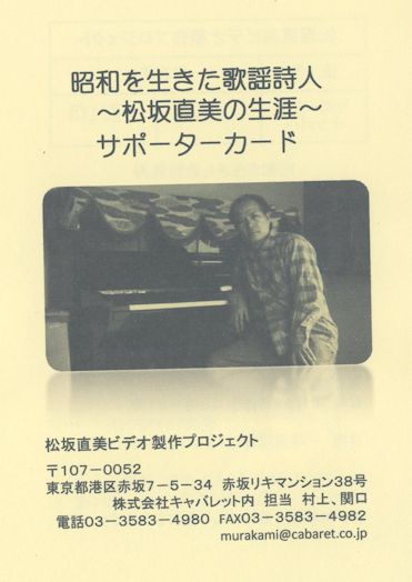 | サポーター試写会のお知らせ 「みんなのチカラで残す!」を合い言葉にご協力を頂いた「昭和を生きた歌謡詩人・松坂直美の生涯」が完成します。ひとりひとりの小さい志がこれだけ大きな作品(エネルギー)を生み出す力になるのだと改めて驚いております。 これもひとえに皆様方のご支援、ご協力のたまものと深く感謝申し上げます。サポーター試写会は、東京、名古屋、大阪、福岡、八丈島など、各地域で会場などの準備が整い次第随時開催していきます。 ■東京会場 ☆日時8月1日(土>10時〜12時開場10時10分上映10時15分〜上映時間91分 ☆会場日比谷図書館大ホール(日比谷公園内) ☆入場料無料(サポーターと関係者が優先ですが、席に空きがあれば一般の方もご覧に なれます) ☆完成披露パーティー 日時8月1日午後1時〜午後3時 会場日比谷松本楼(日比谷公園内) 会費制7000円 ■壱岐会場 ☆日時8月21日(金>18時〜20時30分開場18時30分上映19時〜上映時間91分 ☆会場一岐国博物館多目的ホール ☆入場料無料(サポーターと関係者が優先ですが、席に空きがあれば一般の方もご覧に なれます) ※参加者数を把握するために、同封のはがきにて、各上映会、完成披露パーティーへの 出欠をお願いします。 ★出欠を同封のハガキにご記入の上、7月10日までに届くようにご返事ください。 ★入場のRにはお手数ですが、同封のサポーターカードをお持ちください。 ★入場はサポーター、関係者を優先としますが、席に空きがあれば一般の方もご覧にな れます。 ■中部、関西、福岡、八丈島の上映会に関してのお願い 無料での上映会になりますので、安く借りられる公的機関の映像ホールや会議室など の情報を教えていただけると助かります。収容数は30人から200人程度をイメージして います。 ■一般上映に関しましては、東京と壱岐では、11月に計画しています。詳細が決まり次第お知らせいたします。 ☆DVD配布に関して 私家版DVDのサポーター様への配布に関しましては、本年度秋以降、順次、皆様の手にお届けする予定です。もうしばらくお待ちくださいますようお願い申し上げます。 私ども松坂直美製作プロジェクトも、皆様に良い作品をお届けできるように、全力を掛けて頑張り抜く所存でございます。このプロジェクトは、「みんなのチカラで残す!」の合い言葉通り、サポーターの皆様が主役です。今後とも、皆様のご支援、ご協力をよろしくお願い致します。 2015年5月26日 松坂直美ビデオ製作プロジェクトの連絡先 〒107-0052東京都港区赤坂7-5-34赤坂力マンション38号 (株)キャバレット内担当村上、関口 TELO3-3583-4980FAXO3-3583-4982 E-mail:murakami@cabaret.co.jq ![]() |