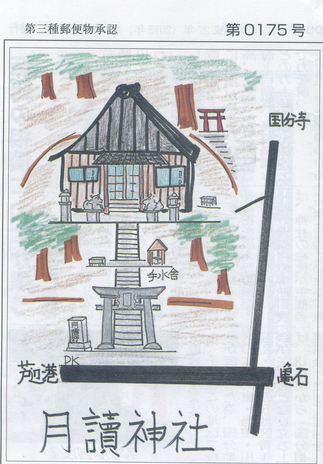 ![]() 神社に逢いに 月読神社(つきよみじんじゃ) 取材:伊佐藤由紀子 古事記に、イザナギノミコトが黄泉の国から帰る時に、筑紫の日向の橘小戸の阿波岐原において喫(みそぎ)の払いを行った際に、左の目を洗いアマテラスオオミカミ、右の目を洗いツキヨミノミコト、鼻を洗いスサノウノミコトが生まれ、この三柱を「三貴神」と呼び八百万の神々とは別格としたと記されています。 月読神社は、この「ツキョミノミコト」を祀ると云われています。いわれでは、「月読神社は箱崎村宗社八幡宮と郷同殿にます神で、箱崎村釘丘郷天月の里に天月神社があり、これが古社となりと伝える…」 神社にある『月読神社縁起』には、顕宗天皇3年(487)阿閉臣事代(あへのおみごとしろ)という管吏が、天皇の命を受けて朝鮮半島の任那(みなま)に使いにでる。その際に人に月の神が神がかりしまして「土地を月の神に奉献せよ、 そうすれば良いことがあろう」というお告げがあり、朝廷が壱岐県主の押見宿禰に命じ月読神社が祀られた。野明天皇2年に、壱岐の公乙等(きみおと)を筑紫の伊都に派遣し神石を求め、一つを京都の月読神社に納めたと云われています。 この石は神功皇后が月神の教えによりお産を延ばされた事で「月延べ石」と名付けられ、壱岐と伊都の鎮懐石八幡宮にもあるそうです。 宝亀33年に暴風雨で木や家が倒れ、占うと月読神の崇りと出たので、忌部正美が神島の大中臣清麻呂を、山城・壱岐・伊勢にある月読神社に派遣して神の怒りを鎮めたと云われています。 国分郷古木村清月に社殿があり、延宝4年(1692)6月朔日建立された拝殿の右に石の御殿があり、拝殿は西北西向で延宝4年藩主松浦公より、石祠及び木鏡が寄進されたそうです。 【祭神】▽(右)ツキヨミノミコト▽(中)ツキヨミノミコト▽(左)ツキユミノミコト 【祭典】旧暦9月23日 ![]() |