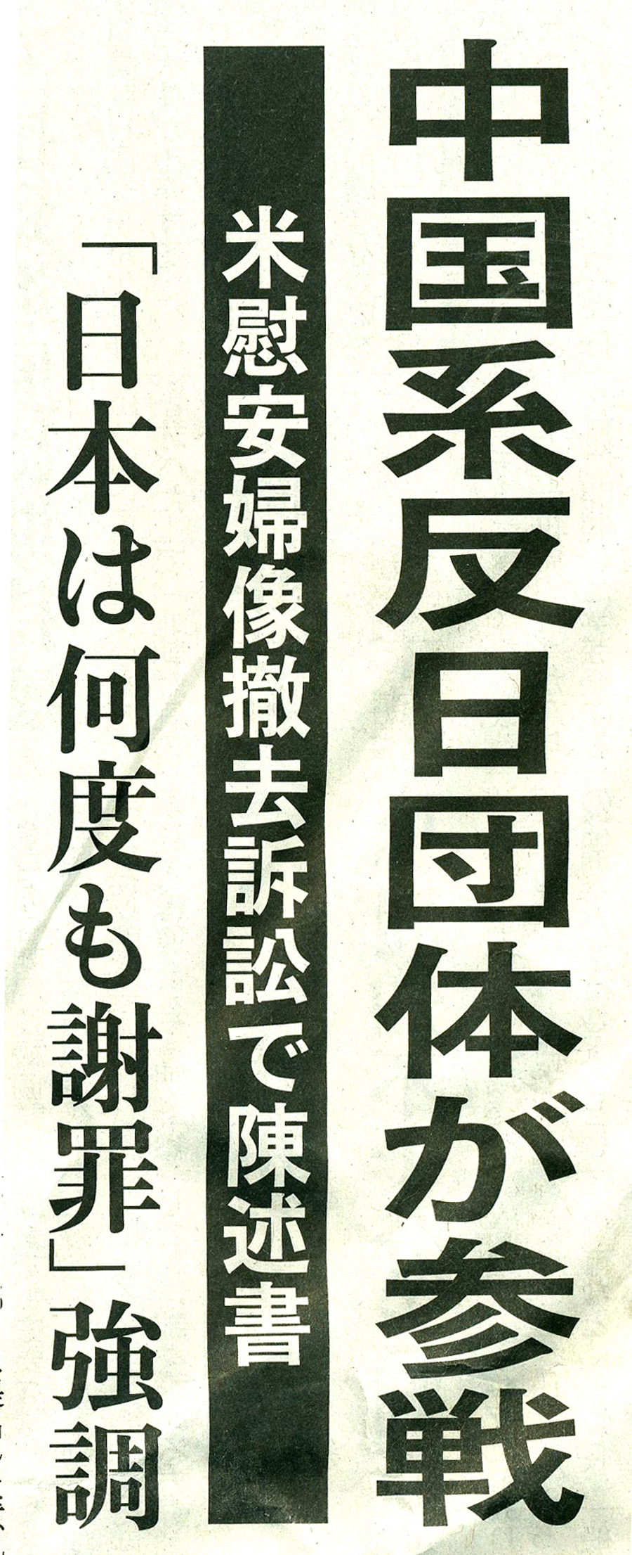 ![]() 米カリフォルニア州グレンデール市が設置した慰安婦像をめぐり、在米日本人らが市に撤去を求めた訴訟で、在米中国系反日団体が「日本政府は慰安婦制度を認め謝罪してきた」との意見陳述書をロサンゼルスの連邦地裁に提出したことがわかった。19日、都内で記者会見した原告の一人、目良浩一氏が明らかにした。 団体は世界的に反日運動を展開する世界抗日戦争史実維護連合会(抗日連合会)。慰安婦像は在米韓国系団体が中心になって設置し、抗日連合会は水面下で支援しているとされてきたが表舞台に出てきた格好だ。 意見陳述書は、訴訟とは無関係の第三者でも裁判所に提出できる。抗日連合会が今月15日に提出した意見陳述書は(慰安婦募集の強制性を認めた平成5年の河野洋平官房長官談話などを引用して、日本が「慰安婦計画」を繰り返し認め、謝罪してきたことを詳述。河野談話の部分では、「慰安所の設置、管理及ぴ慰安婦の移送については、旧日本軍が直接あるいは間接にこれに関与した」との箇所を下線で強調している。 目良氏は「グレンデール市が米連邦政府の独占的領域である外交権を侵したことが訴因であり、意見陳述書は訴訟の本質から外れている」と述べ、反論文書を裁判所に提出する方針を示した。 訴訟では原告側代理人の弁護士事務所が撤退したが、目良氏は裁判続行を強調。撤退の理由について「シリコンバレーの(IT)会社による脅しが決定的な力であったようだ。このことを裏付けるのが意見陳述書だった」と語り、抗日連合会が企業に影響を及ぼした可能性を示唆した。 訴訟は現在、被告である市側と文書のやりとりが続いており、初公判の日程などは未定となっている。 ![]() ![]() ![]() ![]() |
